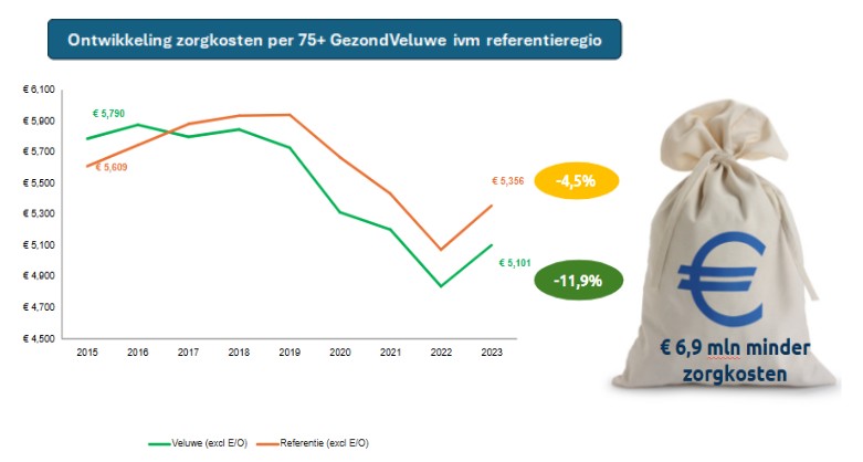 Uit deze vergelijking komt naar voren dat ook in 2023 de totale zorgkosten in de wijkverpleging, huisartsenzorg en medisch specialistische zorg per 75-plusser lager zijn in de Veluwse gemeenten. Ten opzichte van 2015 zijn de kosten zelfs met 12 procent gedaald, terwijl er in vergelijkbare gemeenten sprake was van een daling van 4,5 procent (landelijk was de daling 4 procent).