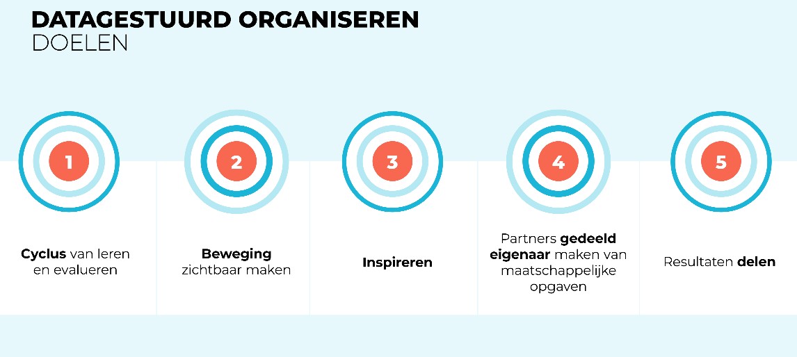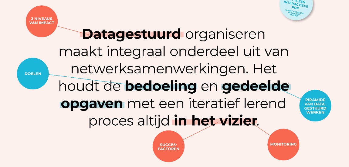 In onze visie is datagestuurd organiseren te allen tijde een integraal onderdeel van netwerksamenwerkingen op alle niveaus (buurt, wijk, regio). Het creëren van een cyclus van reflecteren, waarnemen en leren, waarin betrokken partijen voortdurend inzichten opdoen en processen verbeteren, staat centraal. Op deze manier worden partners gedeeld eigenaar van de maatschappelijke opgaven/bedoelingen en worden resultaten gedeeld.