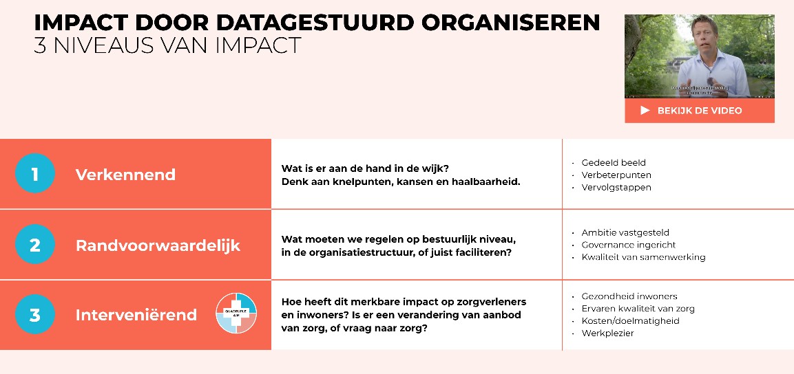 Achtereenvolgens beschrijven wij de drie niveaus van impact, gaan wij in op de doelen, samenhang en succesfactoren. Wij gaan hierna dieper in op de samenhang (3) en de succesfactoren (4) van datagestuurd organiseren.