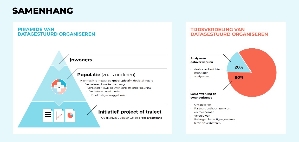 De piramide van datagestuurd organiseren biedt een gestructureerde weergave van hoe data gebruikt wordt om maatschappelijke impact te realiseren. Aan de top van de piramide staan de inwoners, zij vormen het uiteindelijke doel van de inspanningen: het verbeteren van hun gezondheid en welzijn. Een laag daaronder bevindt zich de subpopulatie, zoals ouderen, jongeren of andere doelgroepen, waarop de doelstellingen en verbeteringen zijn gericht. Hier wordt de impact gemeten aan de hand van de Quadruple Aim-doelstellingen: verbeteren van de gezondheid, verbeteren kwaliteit van zorg en ondersteuning, verbeteren werkplezier en doelmatiger zorggebruik. De basis van de piramide wordt gevormd door initiatieven, projecten en trajecten die de uitvoering en praktische invulling van deze doelen mogelijk maken.