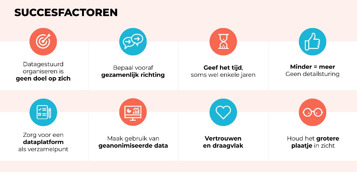 We identificeren verschillende succesfactoren die allemaal relevant zijn. Wij zouden het mooi vinden als de netwerken in hun visie meenemen dat datagestuurd organiseren en impact geen doel op zich is maar hulpmiddel om beweging binnen hun netwerk te volgen. Laat je dus niet verleiden tot detail sturing, houd het grotere plaatje in zicht en geef steeds als motto mee bij het verzamelen van cijfers, indicatoren, verhalen van professionals of burgers, “minder is meer”!